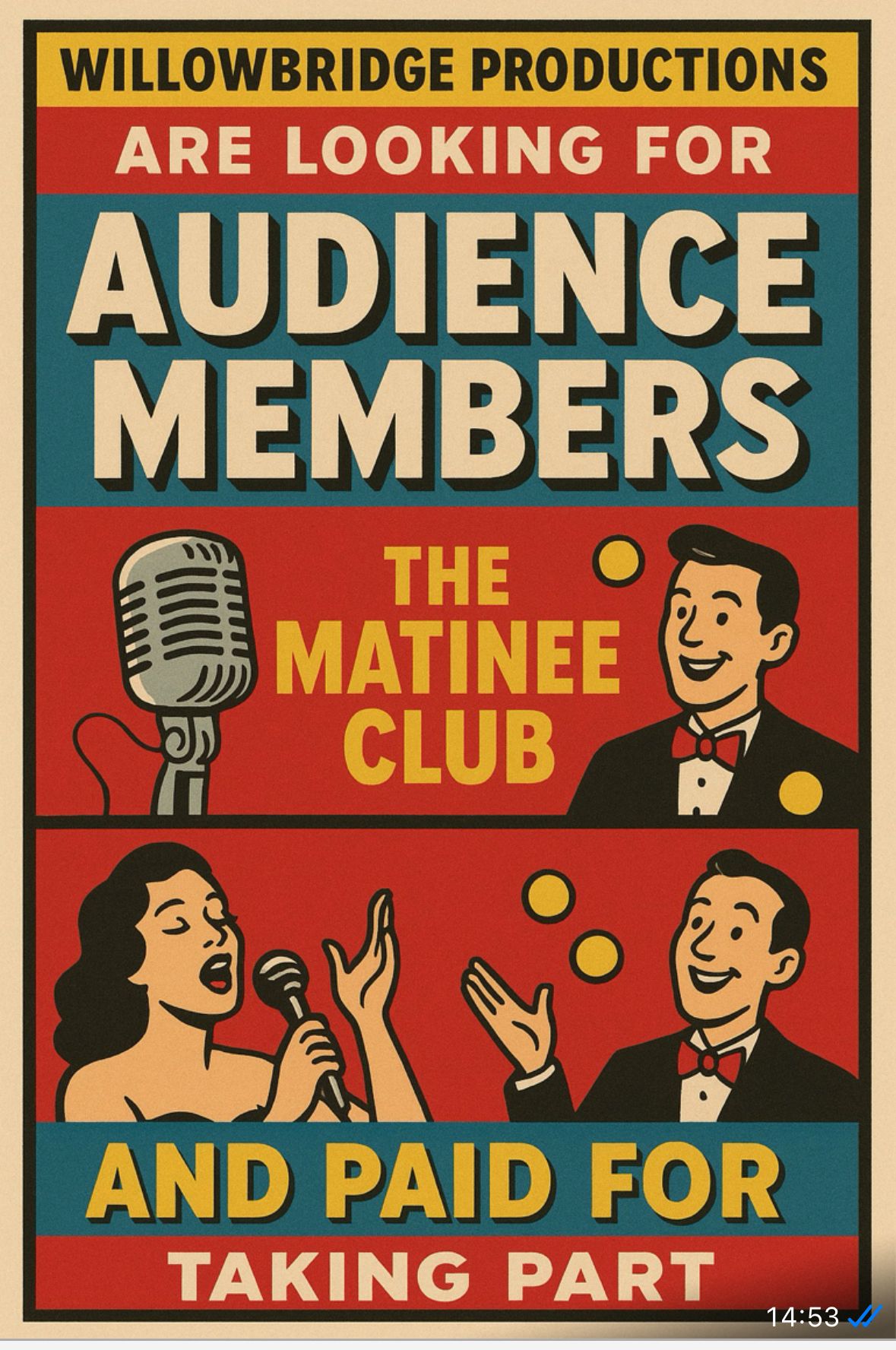 Willowbridge Productions are looking for audience members to take part in filming for a new show they're making called The Matinee Club (working title).
